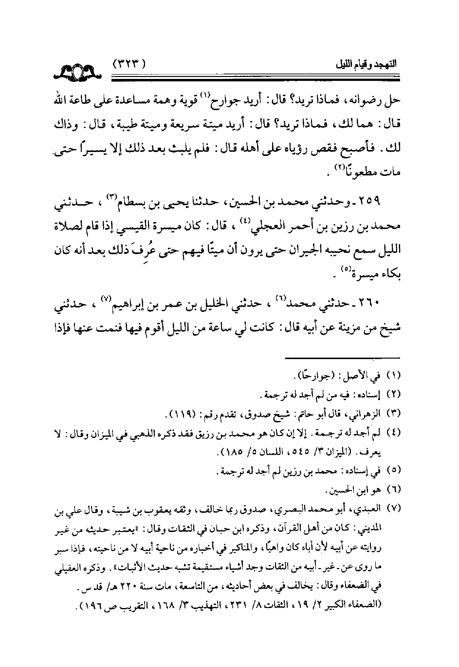 259 - وحدثني محمد بن الحسين حدثنا يحيى بن بسطام حدثني محمد بن رزين بن أحمر العجلي قال كان ميسرة القيسي إذا قام لصلاة الليل سمع نحيبه لجيران حتى يرون أن ميتا فيهم حتى عرف ذلك بعد أنه كان بكاء ميسرة