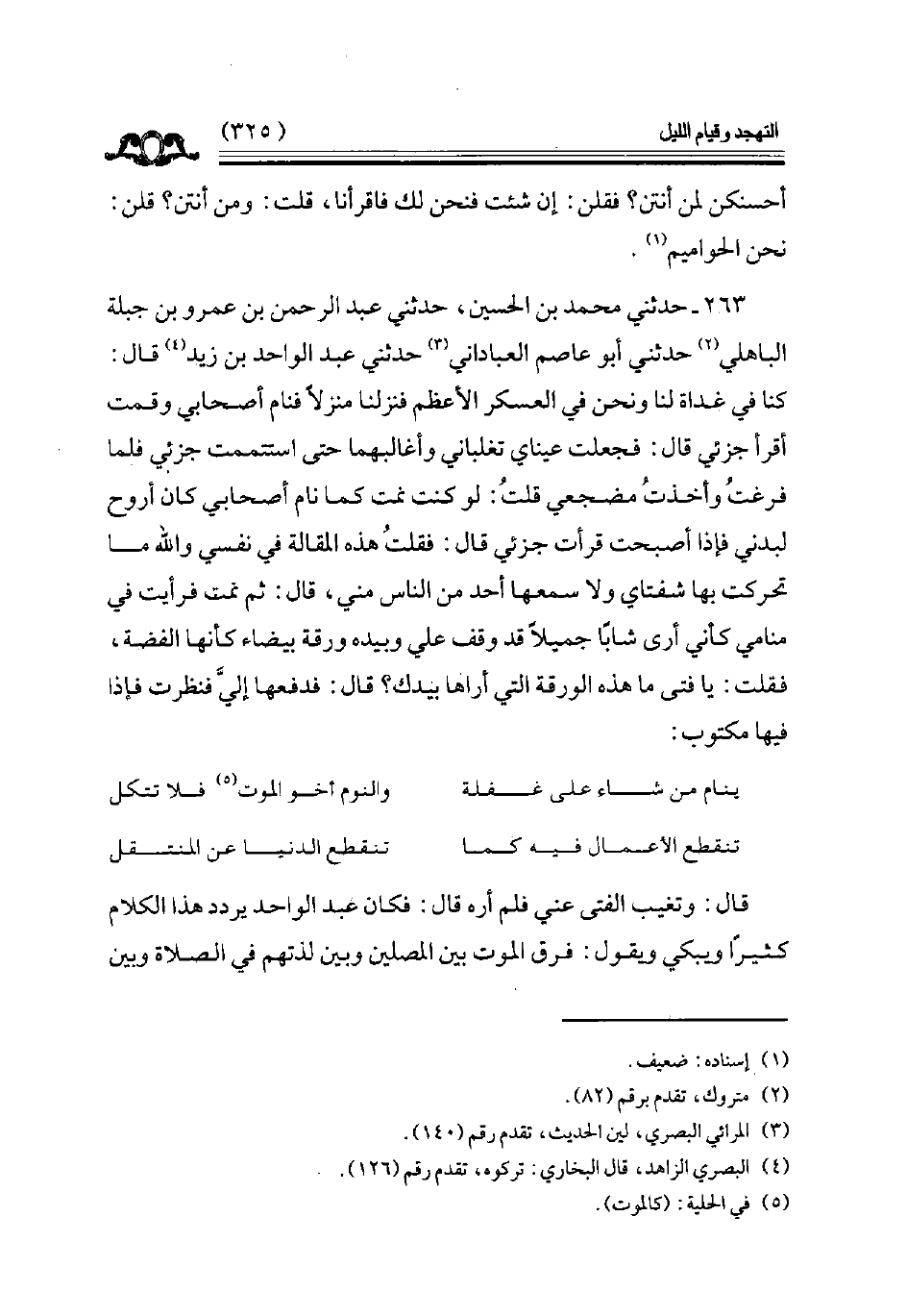 263 - حدثني محمد بن الحسين حدثني عبد الرحمن بن عمرو بن جبلة الباهلي حدثني أبو عاصم العباداني حدثني عبد الواحد بن زيد قال كنا في غداة لنا ونحن في العسكر الأعظم فنزلنا منزلا فنام أصحابي وقمت أقرأ جزئي قال فجعلت عيناي تغلباني وأغالبهما حتى استتممت جزئي فلما فرغت وأخذت مضجعي قلت لو كنت نمت كما نام أصحابي كان أروح لبدني فإذا أصبحت قرأت جزئي قال فقلت هذه المقالة في نفسي والله ما تحركت بها شفتاي ولا سمعها أحد من الناس مني قال ثم نمت فرأيت في منامي كأني أرى شابا جميلا قد وقف علي وبيده ورقة بيضاء كأنها الفضة فقلت يا فتى ما هذه الورقة التي أراها بيدك قال فدفعها إلي فنظرت فإذا فيها مكتوب