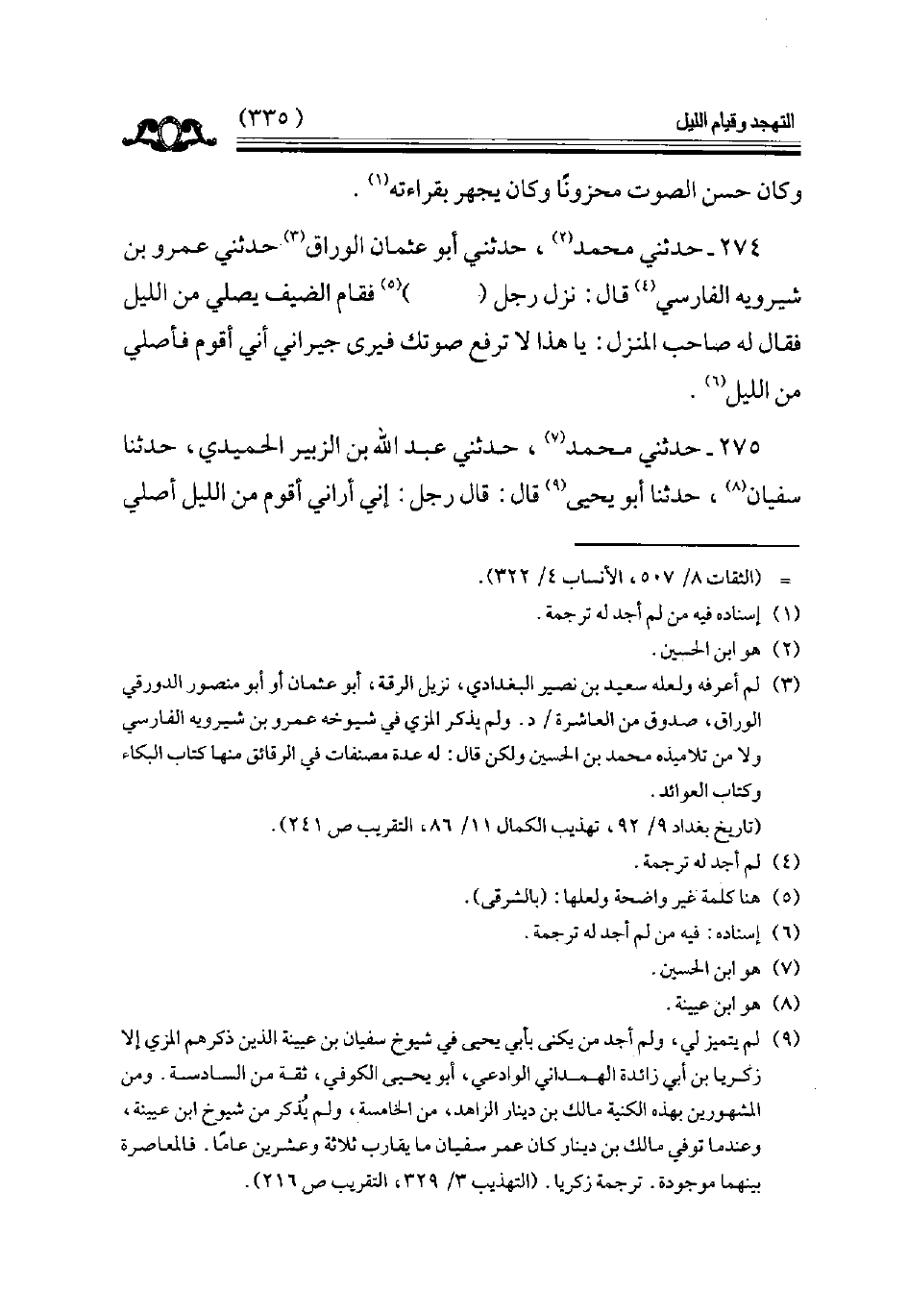 274 - حدثني محمد حدثني أبو عثمان الوراق حدثني عمرو بن شيرويه الفارسي قال نزل رجل . . . . . فقام الضيف يصلي من الليل فقال له صاحب المنزل يا هذا لا ترفع صوتك فيرى جيراني أني أقوم فأصلي من الليل // إسناده فيه من لم أجد له ترجمة //