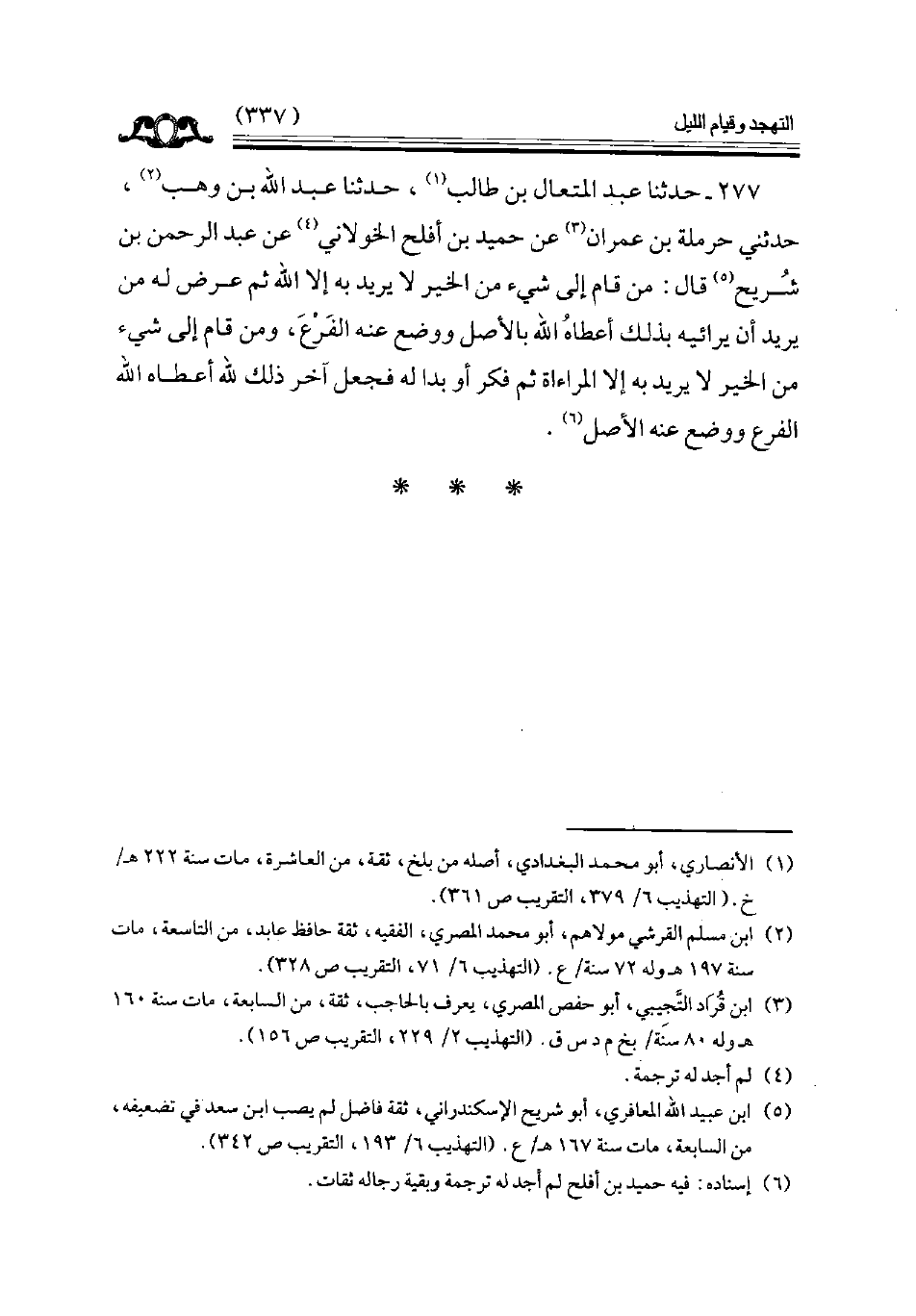 277 - حدثنا عبد المتعال بن طالب حدثنا عبد الله بن وهب حدثني حرملة بن عمران عن حميد بن أفلح الخولاني عن عبد الرحمن بن شريح قال من قام إلى شيء من الخير لا يريد به إلا الله ثم عرض له من يريد أن يرائيه بذلك أعطاه الله بالأصل ووضع عنه الفرع ومن قام إلى شيء من الخير لا يريد به إلا المراءاة ثم فكر أو بدا له فجعل آخر ذلك لله أعطاه الله الفرع ووضع عنه الأصل // إسناده فيه حميد بن أفلح لم أجد له ترجمة //