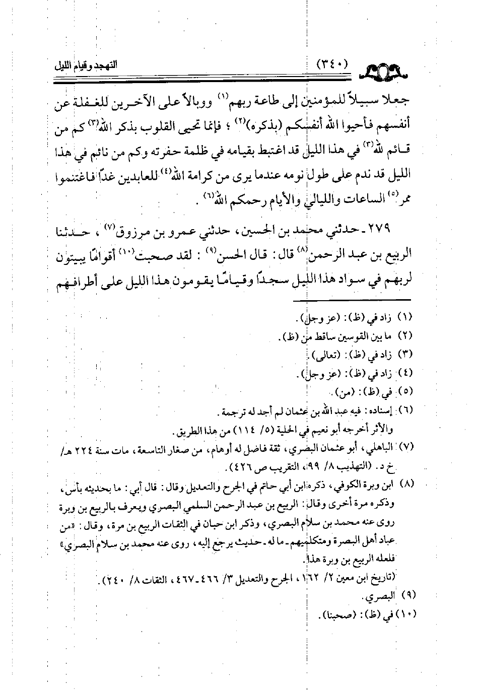 279 - حدثني محمد بن الحسين حدثني عمرو بن مرزوق حدثنا الربيع بن عبد الرحمن قال قال الحسن لقد صحبت أقواما يبيتون لربهم في سواد هذا الليل سجدا وقياما يقومون هذا الليل على أطرافهم
