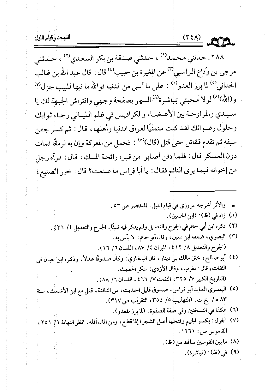 288 - حدثني محمد حدثني صدقة بن بكر السعدي حدثني مرجي بن وداع الراسبي عن المغيرة بن حبيب قال قال عبد الله بن غالب الحداني لما برز العدو على ما آسى من الدنيا فوالله ما فيها للبيب جزل والله لولا محبتي بمباشرة السهر بصفحة وجهي وافتراش الجبهة لك يا سيدي والمراوحة بين الأعضاء والكراديس في ظلم الليالي رجاء ثوابك وحلول رضوانك لقد كنت متمنيا لفراق الدنيا وأهلها قال ثم كسر جفن سيفه ثم تقدم فقاتل حتى قال فحمل من المعركة وإن به لرمقا فمات دون العسكر قال فلما دفن أصابوا من قبره رائحة المسك قال فرآه رجل من إخوانه فيما يرى النائم فقال يا أبا فراس ما صنعت قال خير الصنيع