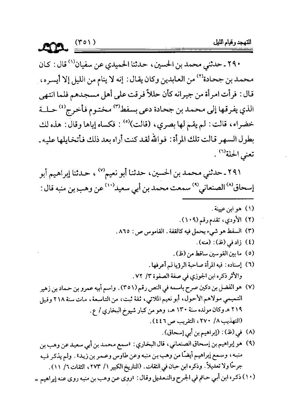 290 - حدثني محمد بن الحسين حدثنا الحميدي عن سفيان قال كان محمد بن جحادة من العابدين وكان يقال أنه لا ينام من الليل إلا أيسره قال فرأيت امرأة من جيرانه كأن عليه حللا فرقت على أهل مسجدهم فلما انتهى الذي يفرقها إلى محمد بن جحادة دعى بسفط مختوم فأخرج حلة خضراء قالت لم يقم لها بصري قالت فكساه إياها وقال هذه لك بطول السهر قالت تلك المرأة فوالله لقد كنت أراه بعد ذلك فأتخايلها عليه تعني الحلة // إسناده فيه المراة صاحبة الرؤيا لم أعرفها //