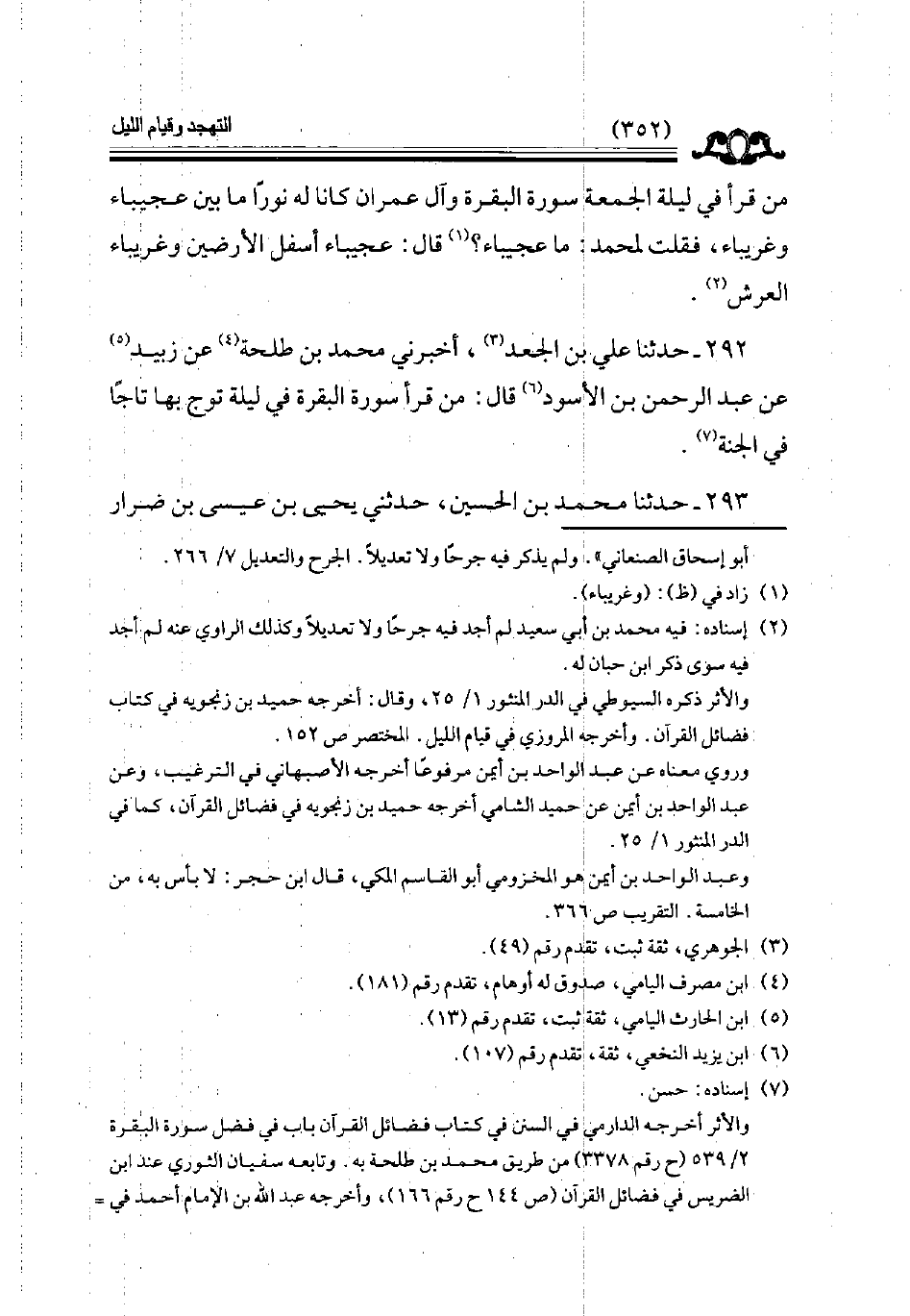 292 - حدثنا علي بن الجعد أخبرني محمد بن طلحة عن زبيد عن عبد الرحمن بن الأسود قال من قرأ سورة البقرة في ليلة توج بها تاجا في الجنة // إسناده حسن //