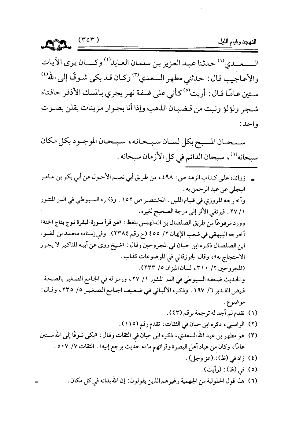 السعدي حدثنا عبد العزيز بن سلمان العابد وكان يرى الآيات والأعاجيب قال حدثني مطهر السعدي وكان قد بكى شوقا إلى الله ستين عاما قال أريت كأني على ضفة نهر يجري بالمسك الأذفر حافتاه شجر ولؤلؤ ونبت من قضبان الذهب وإذا أنا بجوار مزينات يقلن بصوت واحد
