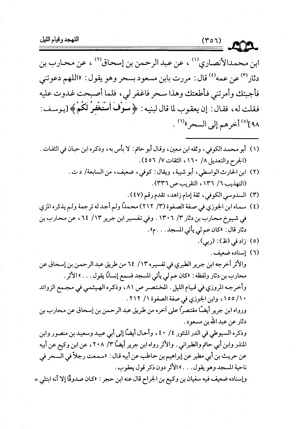 أبو محمد الأنصاري عن عبد الرحمن بن إسحاق عن محارب بن دثار عن عمه قال مررت بابن مسعود بسحر وهو يقول اللهم دعوتني فأجبتك وأمرتني فأطعتك وهذا سحر فاغفر لي فلما أصبحت غدوت عليه فقلت له فقال إن يعقوب لما قال لبنيه ( سوف استغفر لكم ) يوسف 98 أخرهم إلى السحر // إسناده ضعيف //