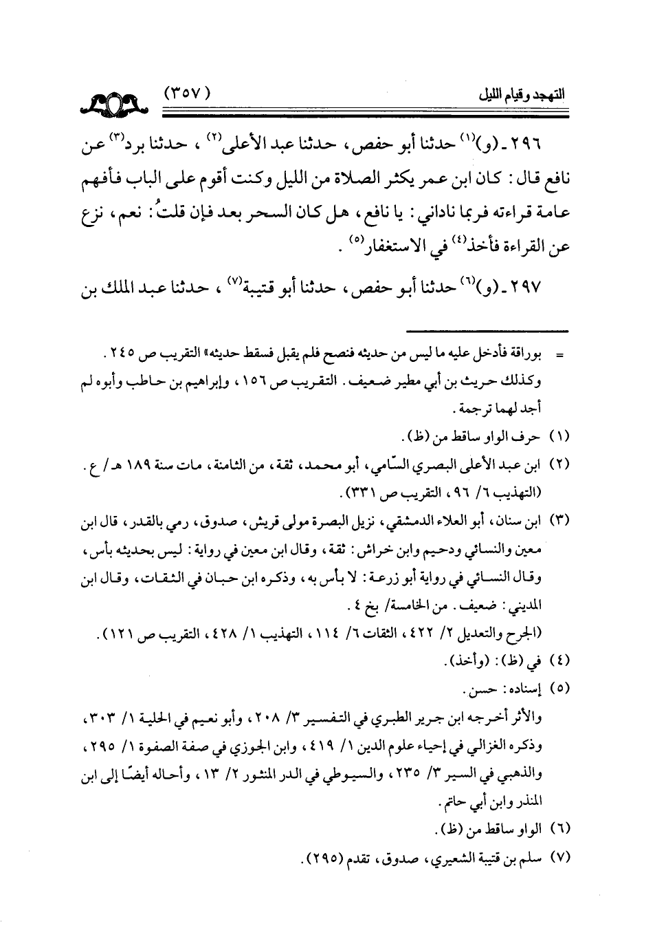 296 - وحدثنا أبو حفص حدثنا عبد الأعلى حدثنا برد عن نافع قال كان ابن عمر يكثر الصلاة من الليل وكنت أقوم على الباب فأفهم عامة قراءته فربما ناداني يا نافع هل كان السحر بعد فإن قلت نعم نزع عن القراءة فأخذ في الاستغفار // إسناده حسن //