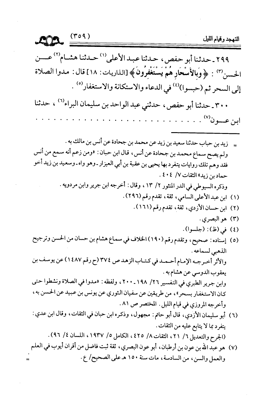 299 - حدثنا أبو حفص حدثنا عبد الأعلى حدثنا هشام عن الحسن ( وبالأسحار هم يستغفرون ) الذاريات 18 قال مدوا الصلاة إلى السحر ثم حبسوا في الدعاء والاستكانة والاستغفار // إسناده صحيح //