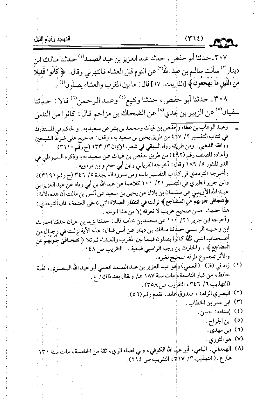 307 - حدثنا أبو حفص حدثنا عبد العزيز بن عبد الصمد حدثنا مالك بن دينار سألت سالم بن عبد الله عن النوم قبل العشاء فانتهرني وقال ( كانوا قليلا من الليل ما يهجعون ) الذاريات 17 قال ما بين المغرب والعشاء يصلون // إسناده حسن //