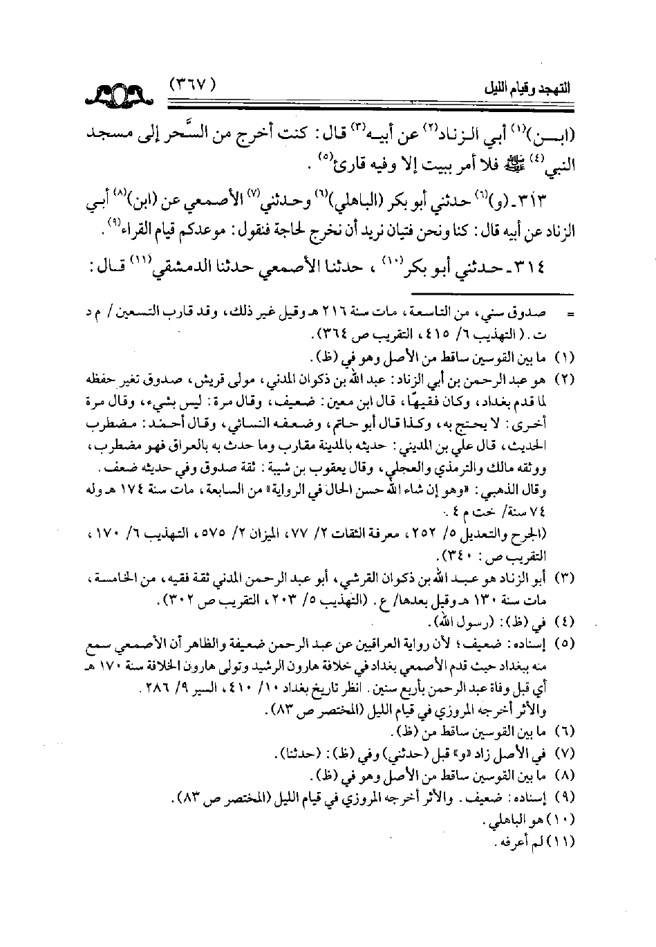 313 - وحدثني أبو بكر الباهلي وحدثني الأصمعي عن ابن أبي الزناد عن أبيه قال كنا ونحن فتيان نريد أن نخرج لحاجة فنقول موعدكم قيام القراء // إسناده ضعيف //