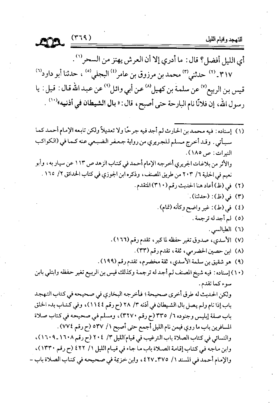 317 - حدثني محمد بن مرزوق بن عامر البجلي حدثنا أبو داود قيس بن الربيع عن سلمة بن كهيل عن أبي وائل عن عبد الله قال قيل يا رسول الله إن فلانا نام البارحة حتى أصبح قال ( بال الشيطان في أذنيه ) // إسناده فيه شيخ المصنف لم أجد له ترجمة //