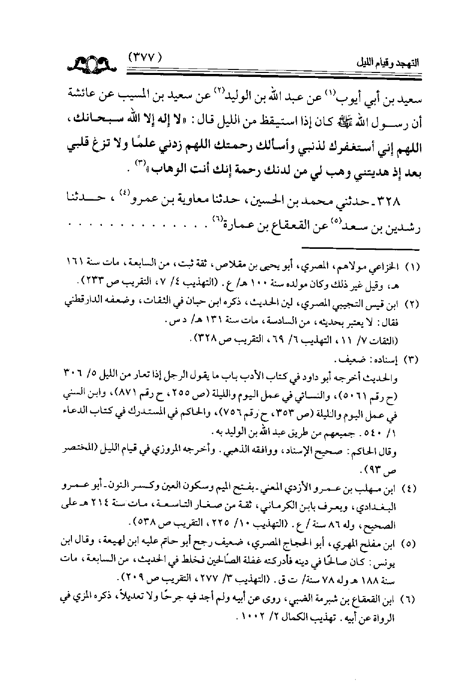 سعيد بن أبي أيوب عن عبد الله بن الوليد عن سعيد بن المسيب عن عائشة أن رسول الله كان إذا استيقظ من الليل قال ( لا إله إلا الله سبحانك اللهم إني أستغفرك لذنبي وأسألك رحمتك اللهم زدني علما ولا تزغ قلبي بعد إذ هديتني وهب لي من لدنك رحمة إنك أنت الوهاب ) // إسناده ضعيف //