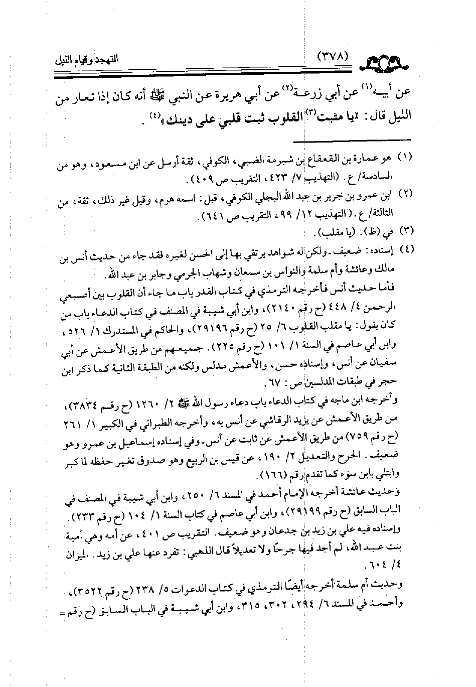 عن أبيه عن أبي زرعة عن أبي هريرة عن النبي أنه كان إذا تعار من الليل قال ( يا مثبت القلوب ثبت قلبي على دينك ) // إسناده ضعيف //