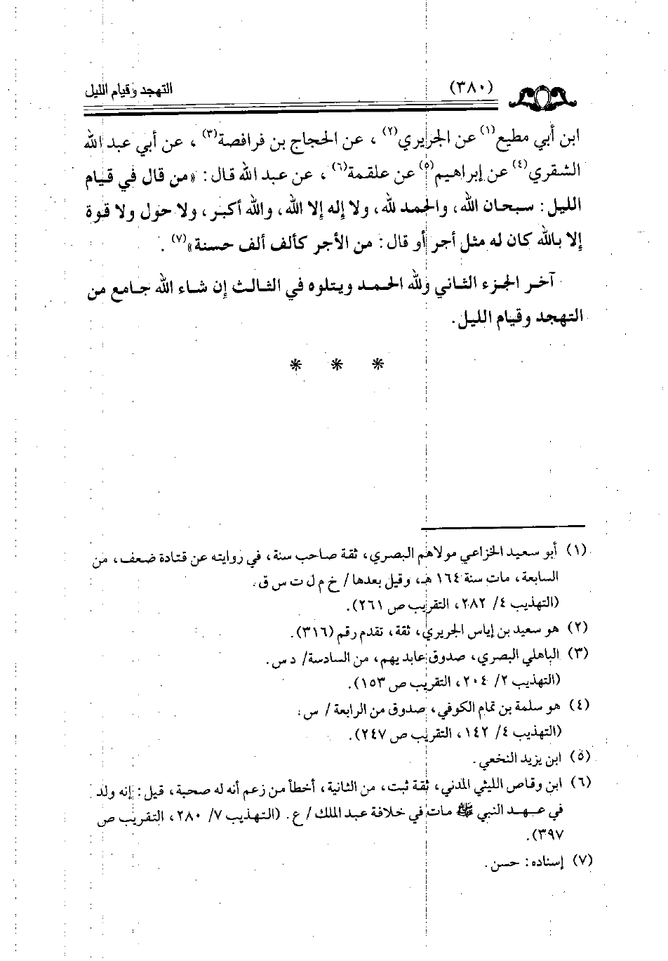 ابن أبي مطيع عن الجريري عن الحجاج بن فرافصة عن أبي عبد الله الشقري عن إبراهيم عن علقمة عن عبد الله قال من قال في قيام الليل سبحان الله والحمد لله ولا إله إلا الله والله أكبر ولا حول ولا قوة إلا بالله كان له مثل أجر أو قال من الأجر كألف ألف حسن // إسناده حسن //