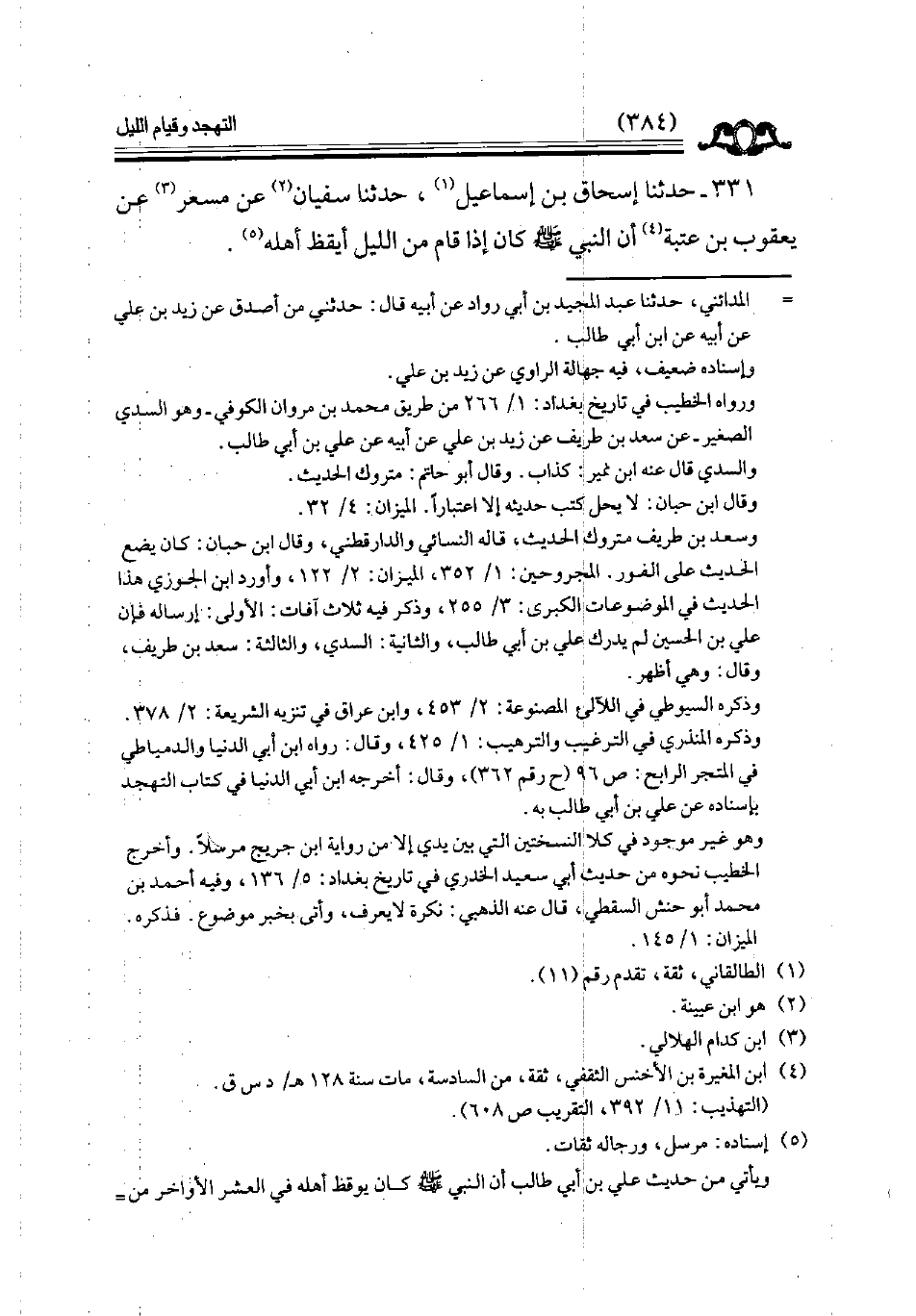 331 - حدثنا إسحاق بن إسماعيل حدثنا سفيان عن مسعر عن يعقوب بن عتبة أن النبي كان إذا قام من الليل أيقظ أهله // إسناده مرسل ورجاله ثقات //