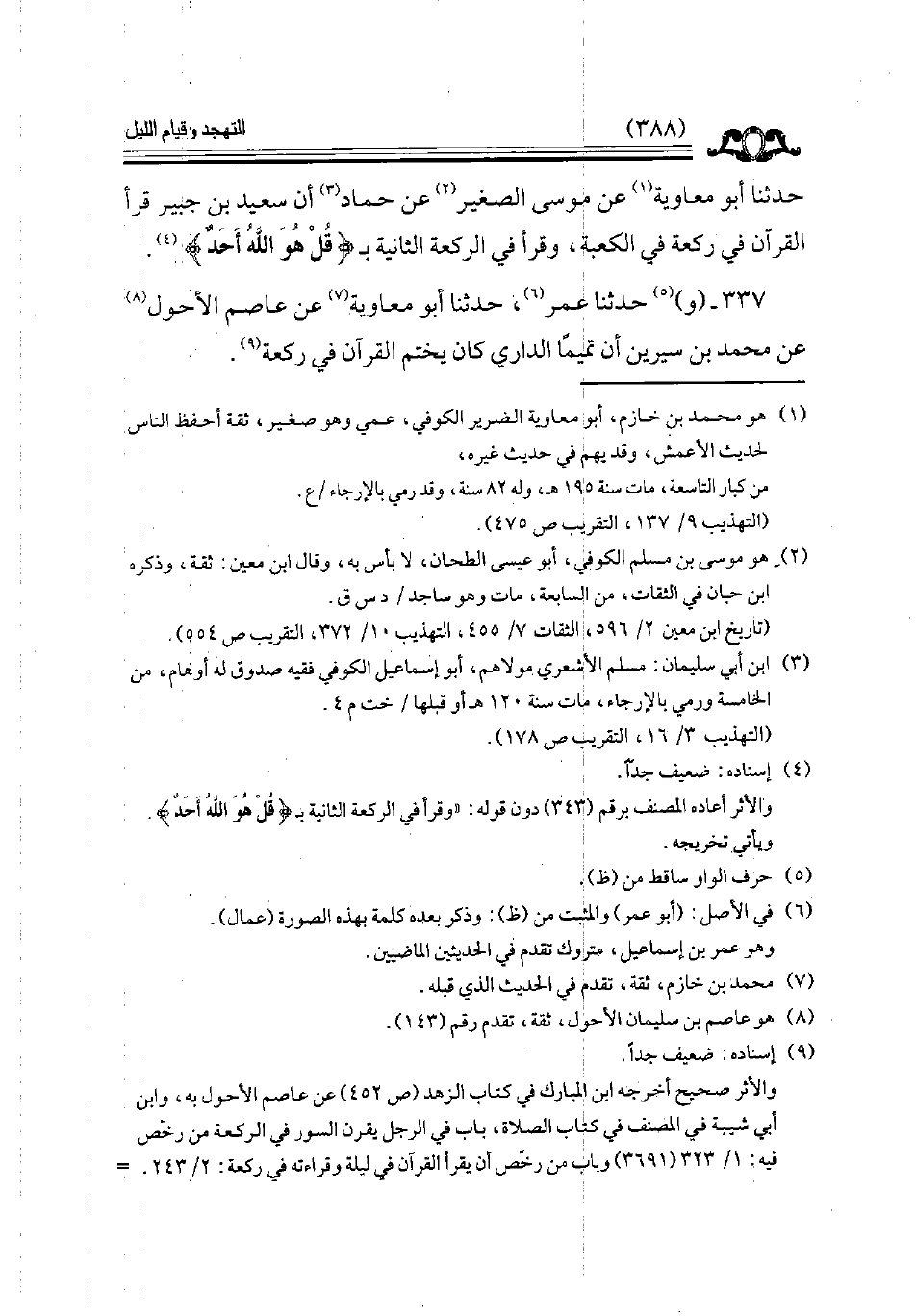 337 - وحدثنا عمر حدثنا أبو معاوية عن عاصم الأحول عن محمد بن سيرين أن تميما الداري كان يختم القرآن في ركعة // إسناده ضعيف جدا //