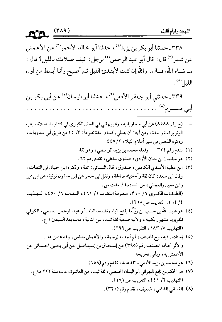338 - حدثنا أبو بكر بن يزيد حدثنا أبو خالد الأحمر عن الأعمش عن شمر قال قال أبو عبد الرحمن لرجل كيف صلاتك بالليل قال ما شاء الله قال والله إن كنت لأبتدئ الليل ثم أصبح وأنا أبسط من أول الليل // إسناده فيه شيخ المصنف لم أجد له ترجمة //