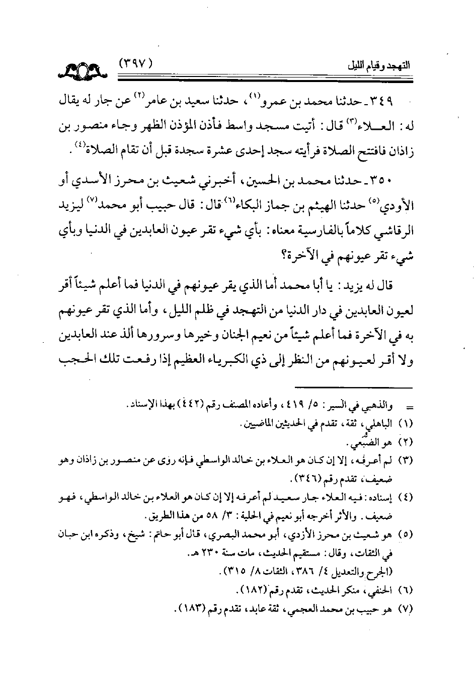 350 - حدثنا محمد بن الحسين أخبرني شعيث بن محرز الأسدي أو الأودي حدثنا الهيثم بن جماز البكاء قال قال حبيب أبو محمد ليزيد الرقاشي كلاما بالفارسية معناه بأي شيء تقر عيون العابدين في الدنيا وبأي شيء تقر عيونهم في الآخرة