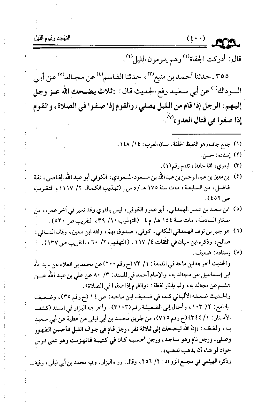 355 - حدثنا أحمد بن منيع حدثنا القاسم عن مجالد عن أبي الوداك عن أبي سعيد رفع الحديث قال ( ثلاث يضحك الله عز و جل إليهم الرجل إذا قام من الليل يصلي والقوم إذا صفوا في الصلاة والقوم إذا صفوا في قتال العدو ) // إسناده ضعيف //