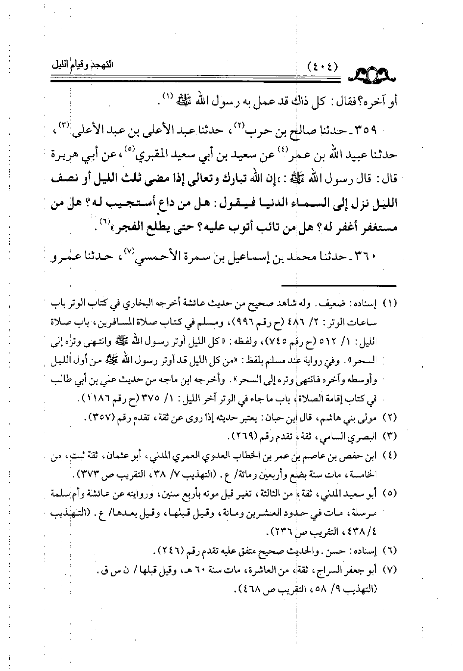 359 - حدثنا صالح بن حرب حدثنا عبد الأعلى بن عبد الأعلى حدثنا عبيد الله بن عمر عن سعيد بن أبي سعيد المقبري عن أبي هريرة قال قال رسول الله ( إن الله تبارك وتعالى إذا مضى ثلث الليل أو نصف الليل نزل إلى السماء الدنيا فيقول هل من داع أستجيب له هل من مستغفر أغفر له هل من تائب أتوب عليه في حتى يطلع الفجر ) // إسناده حسن //