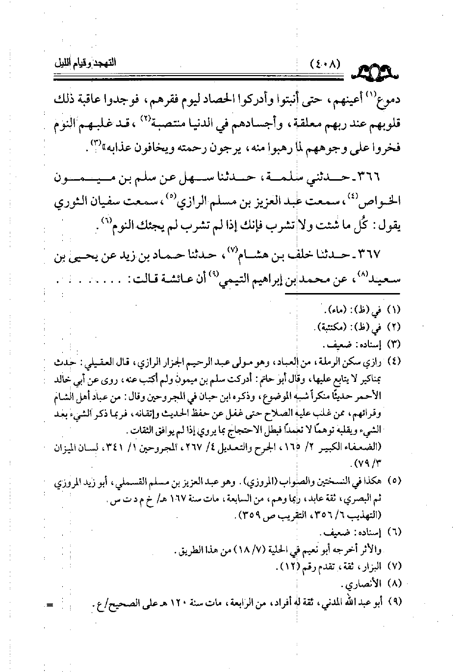 366 - حدثني سلمة حدثنا سهل عبن سلم بن ميمون الخواص سمعت عبد العزيز بن مسلم الرازي سمعت سفيان الثوري يقول كل ما شئت ولا تشرب فإنك إذا لم تشرب لم يجئك النوم // إسناده ضعيف //