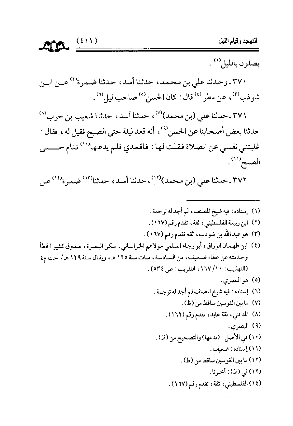370 - وحدثنا علي بن محمد حدثنا أسد حدثنا ضمرة عن ابن شوذب عن مطر قال كان الحسن صاحب ليل // إسناده فيه شيخ المصنف لم أجد له ترجمة //