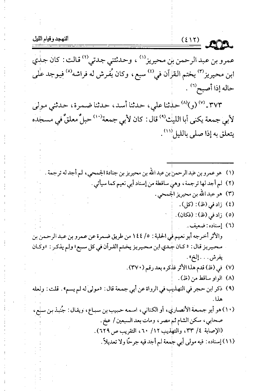 373 - وحدثنا علي حدثنا أسد حدثنا ضمرة حدثني مولى لأبي جمعة يكنى أبا الليث قال كان لأبي جمعة حبل معلق في مسجده يتعلق به إذا صلى بالليل // إسناده فيه مولى أبي جمعة لم أجد فيه جرحا ولا تعديلا //