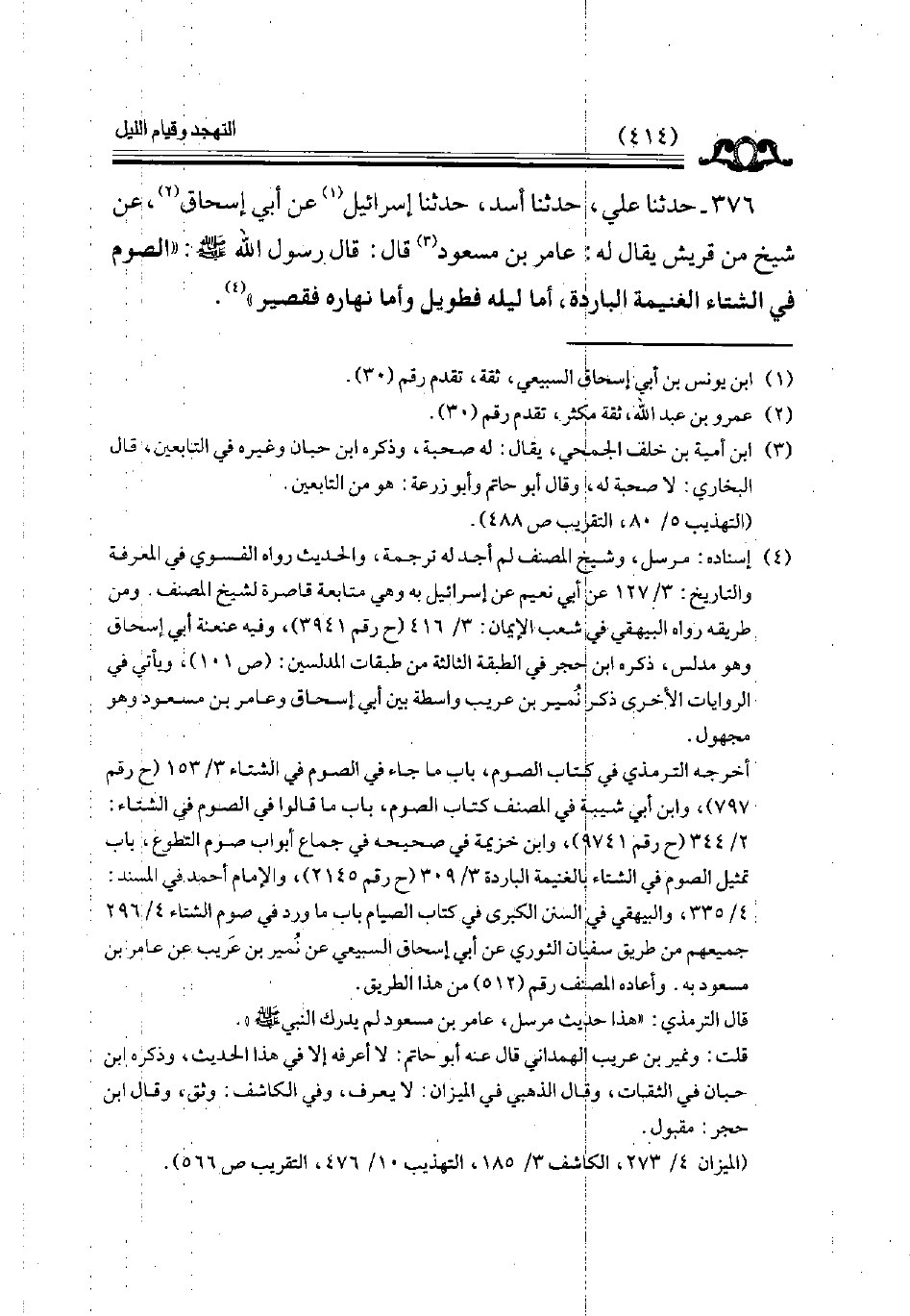 376 - حدثنا علي حدثنا أسد حدثنا إسرائيل عن أبي إسحاق عن شيخ من قريش يقال له عامر بن مسعود قال قال رسول الله ( الصوم في الشتاء الغنيمة الباردة أما ليله فطويل وأما نهاره فقصير ) // إسناده مرسل //