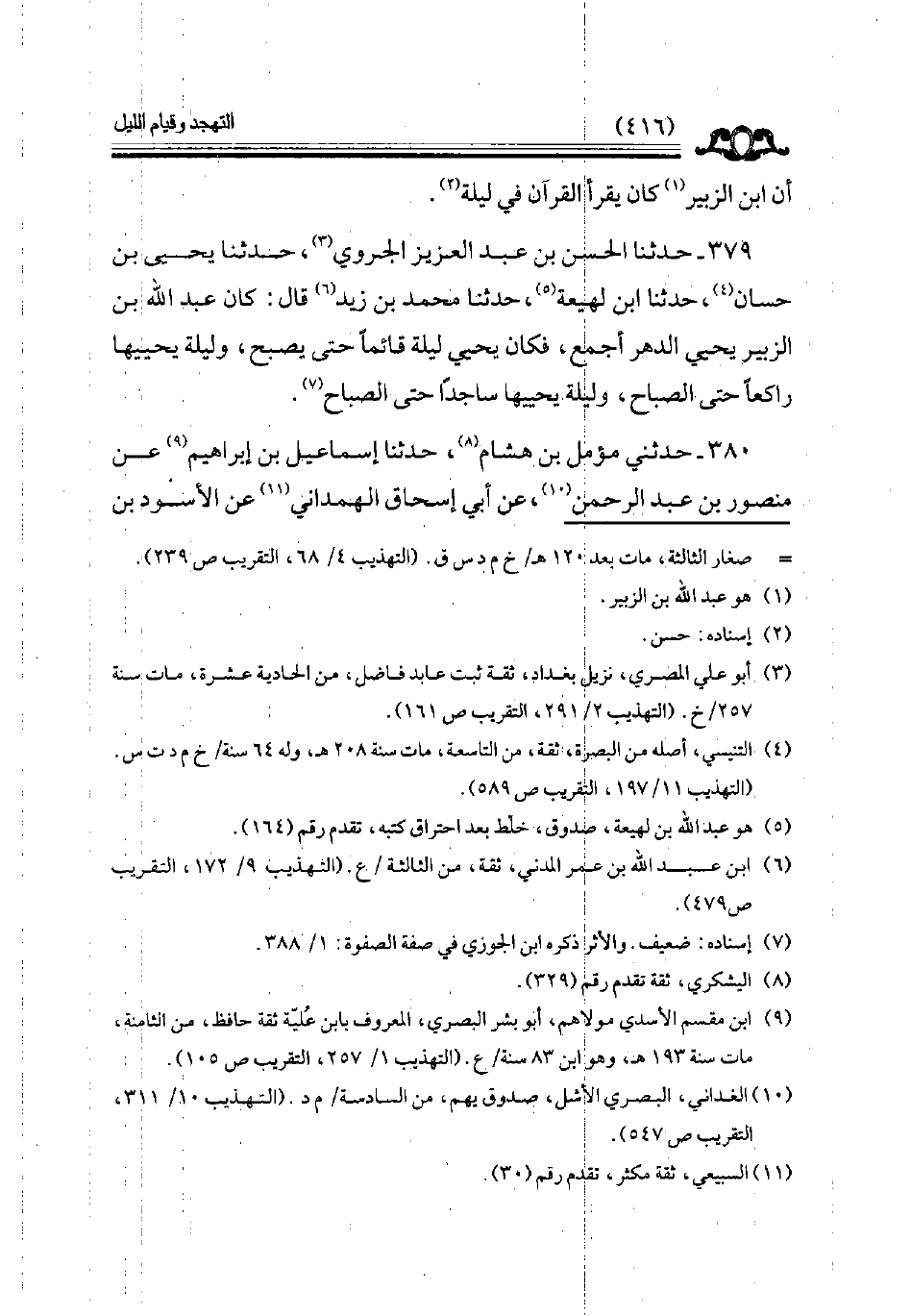 379 - حدثنا الحسن بن عبد العزيز الجروي حدثنا يحيى بن حسان حدثنا ابن لهيعة حدثنا محمد بن زيد قال كان عبد الله بن الزبير يحيي الدهر أجمع فكان يحيي ليلة قائما حتى يصبح وليلة يحييها راكعا حتى الصباح وليلة يحييها ساجدا حتى الصباح // إسناده ضعيف //