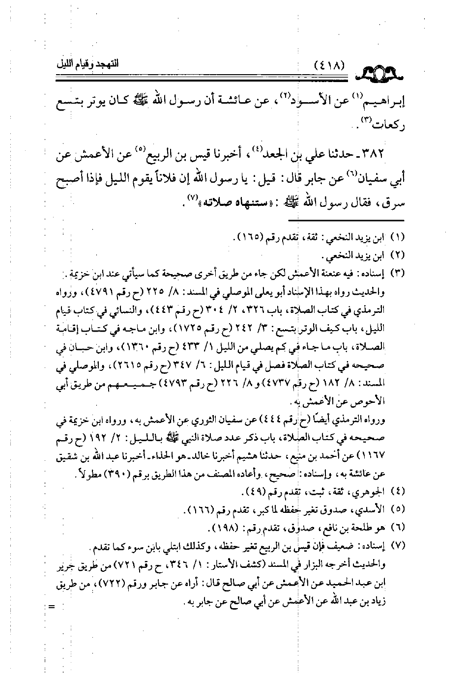 إبراهيم عن الأسود عن عائشة أن رسول الله كان يوتر بتسع ركعات // إسناده فيه عنعنة الأعمش //