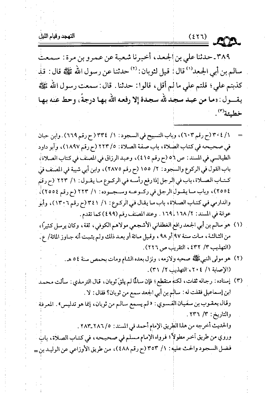 389 - حدثنا علي بن الجعد أخبرنا شعبة عن عمرو بن مرة سمعت سالم بن أبي الجعد قال قيل لثوبان حدثنا عن رسول الله قال قد كذبتم علي قلتم علي ما لم أقل قالوا حدثنا قال سمعت رسول الله يقول ( ما من عبد سجد لله سجدة إلا رفعه الله بها درجة وحط عنه بها خطيئة ) // إسناده رجاله ثقات //