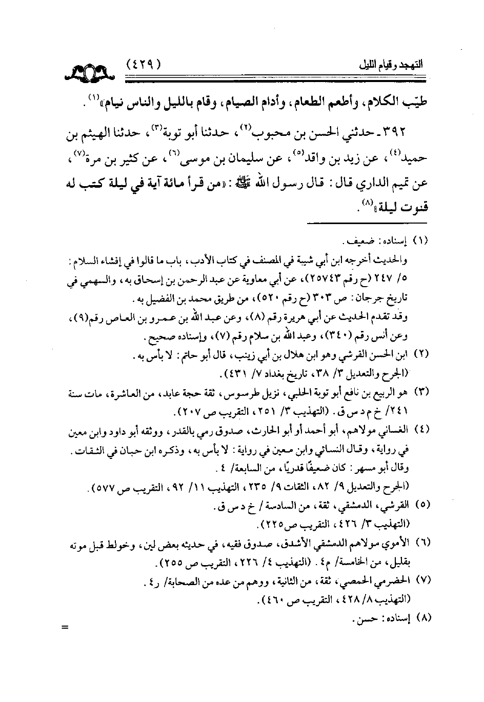 392 - حدثني الحسن بن محبوب حدثنا أبو توبة حدثنا الهيثم بن حميد عن زيد بن واقد عن سليمان بن موسى عن كثير بن مرة عن تميم الداري قال قال رسول الله ( من قرأ مائة آيه في ليلة كتب له قنوت ليلة ) // إسناده حسن //