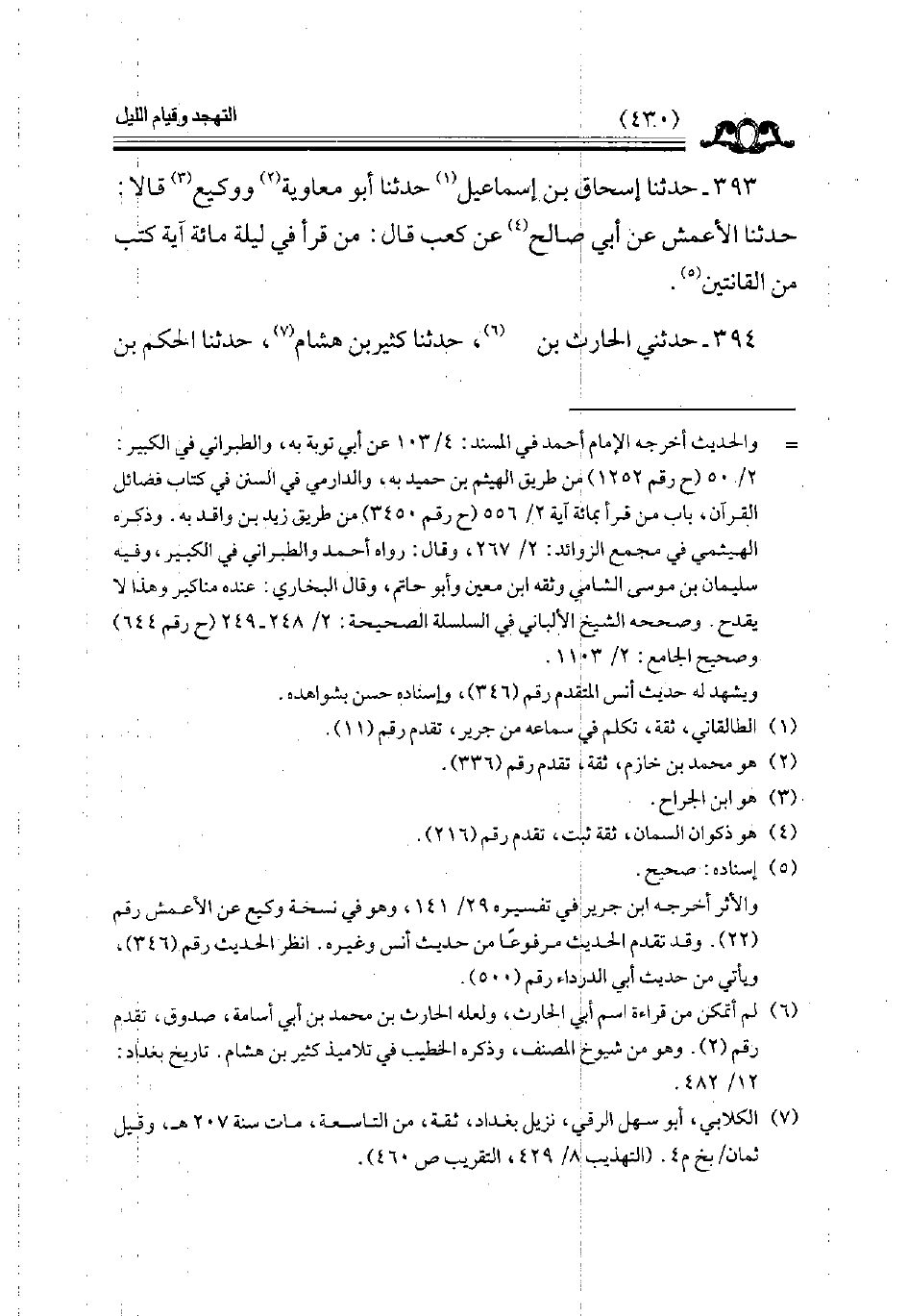 393 - حدثنا إسحاق بن إسماعيل حدثنا أبو معاوية ووكيع قالا حدثنا الأعمش عن أبي صالح عن كعب قال من قرأ في ليلة مائة آية كتب من القانتين // إسناده صحيح //