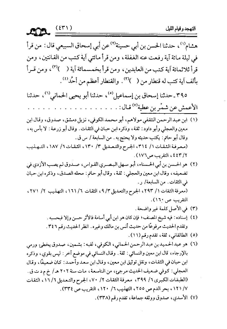 هشام حدثنا الحسن بن أبي حسينة عن أبي إسحاق السبيعي قال من قرأ في ليلة مائة آيه رفعت عنه الغفلة ومن قرأ مائتي آيه كتب من القانتين ومن قرأ ثلاثمائة آيه كتب من العابدين ومن قرأ بخمسمائة آياه من قرأ بألف آيه كتب له قنطار من . . . . . . . والقنطار أعظم من أحد // إسناده فيه شيخ المصنف فإن كان هو بن أبي أسامة فالأثر حسن وإلا فحبسبه //