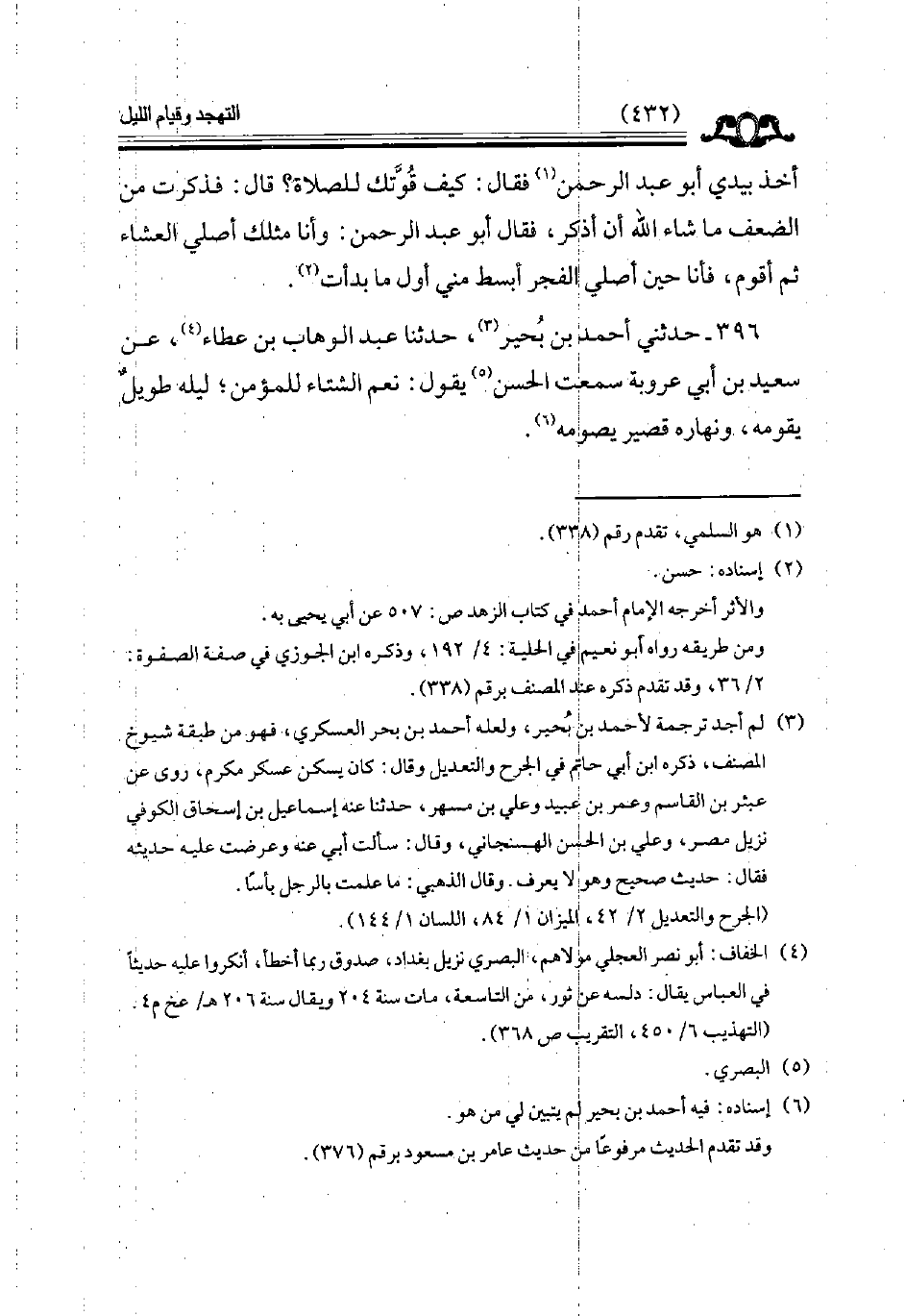 396 - حدثني أحمد بن بحير حدثنا عبد الوهاب بن عطاء عن سعيد بن أبي عروبة سمعت الحسن يقول نعم الشتاء للمؤمن ليلة طويل يقومه ونهاره قصير يصومه // إسناده أحمد فيه أحمد بن بحير لم يتبين لي من هو //