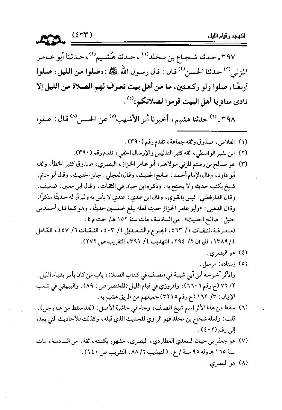 397 - حدثنا شجاع بن مخلد حدثنا هشيم حدثنا أبو عامر المزني حدثنا الحسن قال قال رسول الله ( صلوا من الليل صلوا أربعا صلوا ولو ركعتين ما من أهل بيت تعرف لهم لهم الصلاة من الليل إلا نادى مناد يا أهل البيت قوموا لصلاتكم ) // إسناده مرسل //
