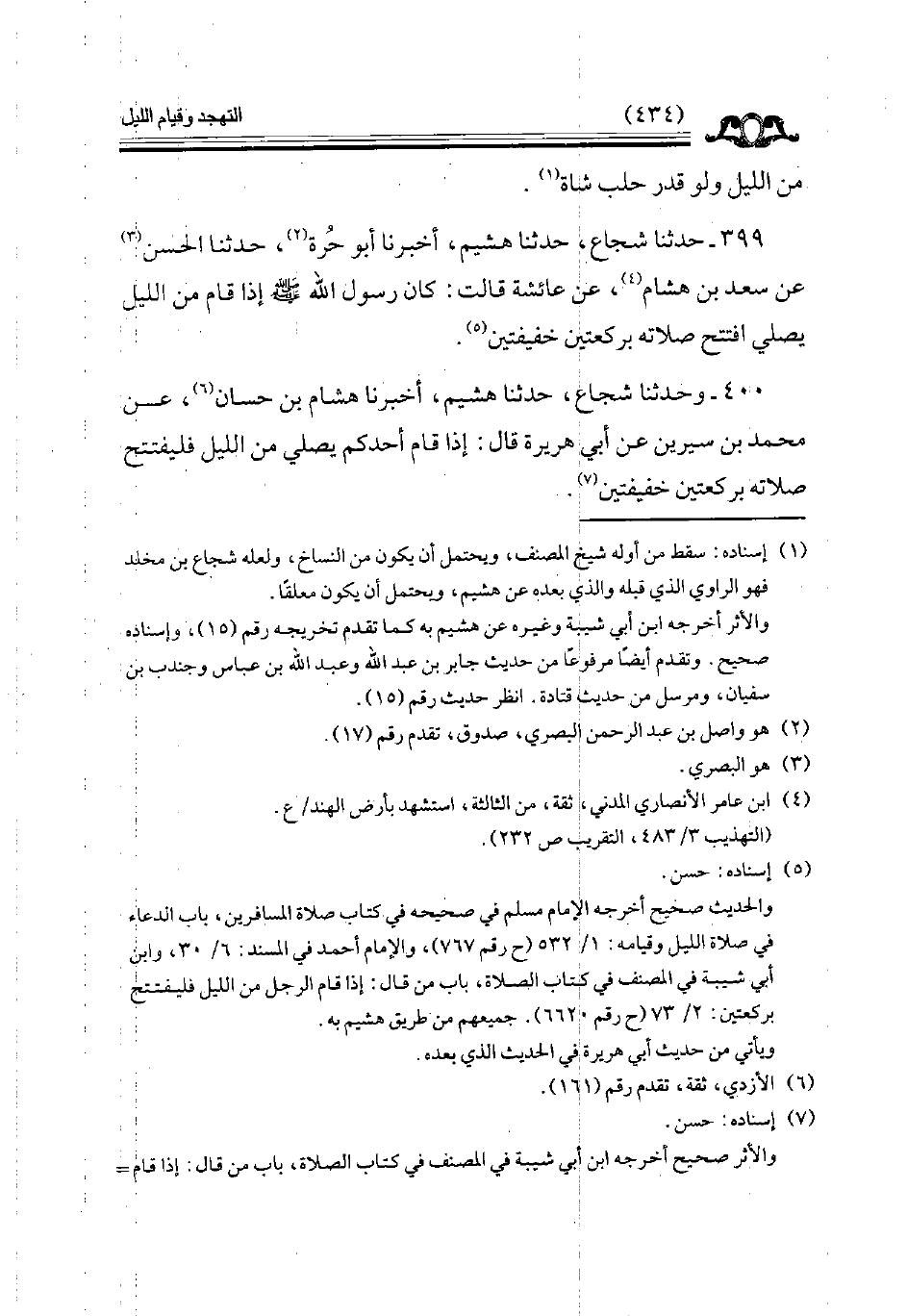 400 - وحدثنا شجاع حدثنا هشيم أخبرنا هشام بن حسان عن محمد بن سيرين عن أبي هريرة قال إذا قام أحدكم يصلي من الليل فليفتتح صلاته بركعتين خفيفتين // إسناده حسن //
