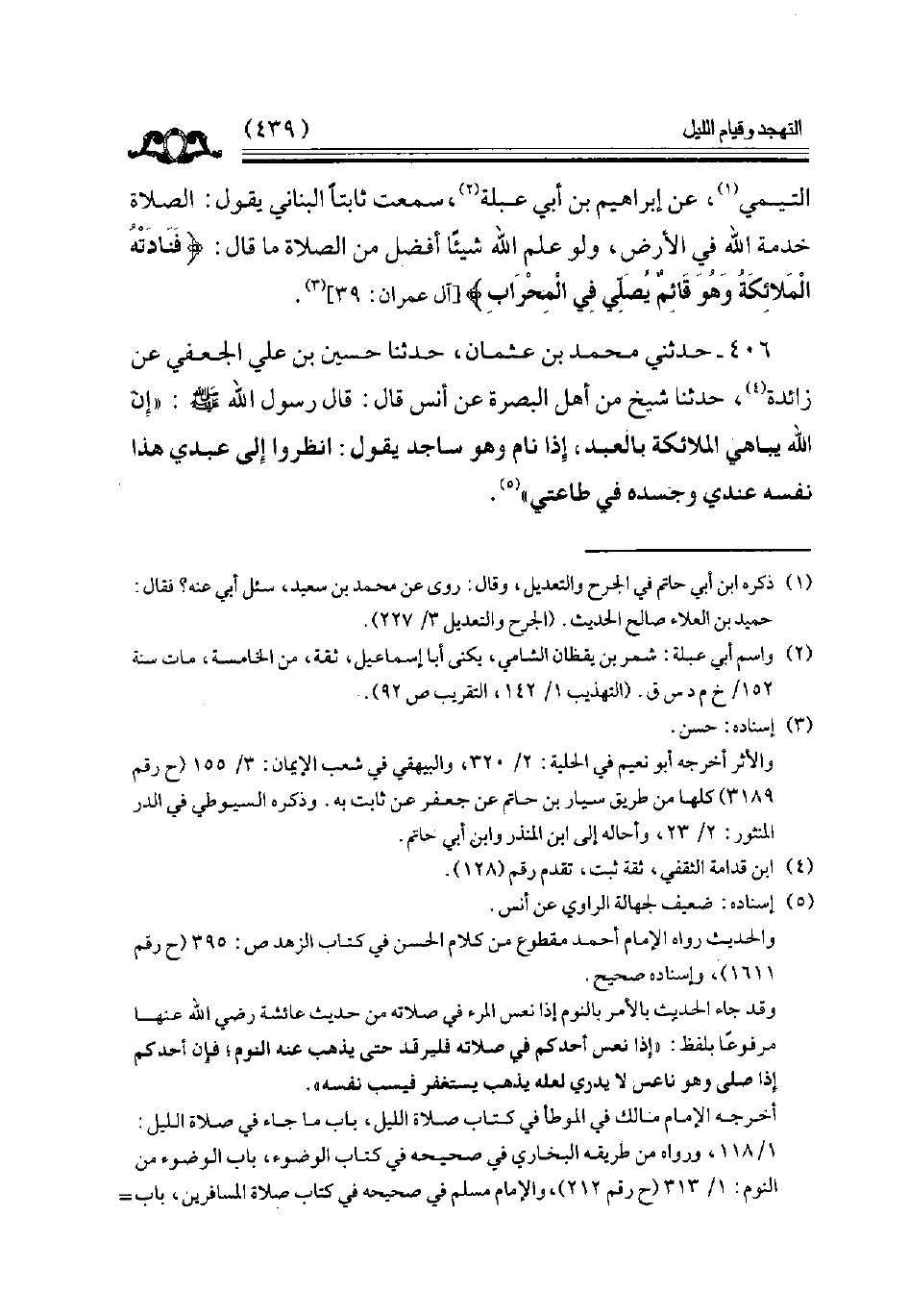 406 - حدثني محمد بن عثمان حدثنا حسين بن علي الجعفي عن زائدة حدثنا شيخ من أهل البصرة عن أنس قال قال رسول الله ( إن الله يباهي الملائكة بالعبد إذا نام وهو ساجد يقول انظروا إلى عبدي هذا نفسه عندي وجسده في طاعتي ) // إسناده ضعيف //