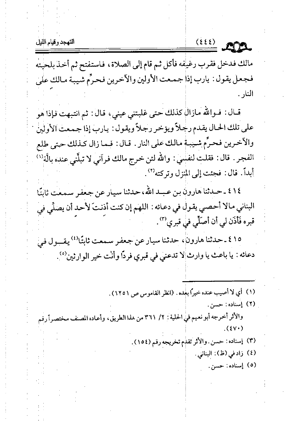 414 - حدثنا هارون بن عبد الله حدثنا سيار عن جعفر سمعت ثابتا البناني مالا أحصي يقول في دعائه اللهم إن كنت أذنت لأحد أن يصلي في قبره فأذن لي أن اصلي في قبري // إسناده حسن //