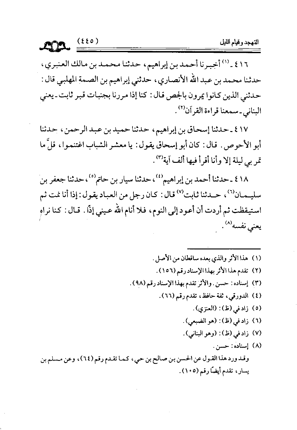 418 - حدثنا أحمد بن إبراهيم حدثنا سيار بن حاتم حدثنا جعفر بن سليمان حدثنا ثابت قال كان رجل من العباد يقول إذا أنا نمت ثم استيقظت ثم أردت أن أعود إلى النوم فلا أنام الله عيني إذا قال كنا نراه يعني نفسه // إسناده حسن //