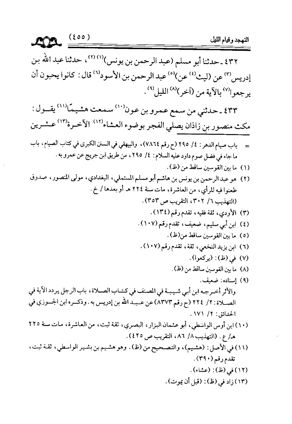 433 - حدثني من سمع عمرو بن عون سمعت هشيما يقول مكث منصور بن زاذان يصلي الفجر بوضوء العشاء الآخرة عشرين
