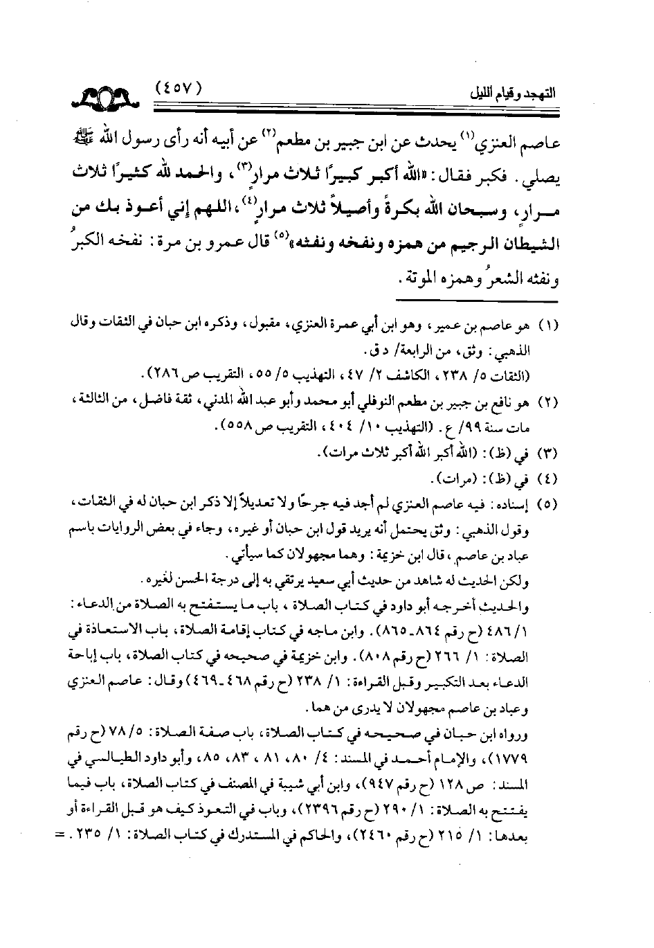 عاصم العنزي يحدث عن أبن جبير بن مطعم عن أبيه أنه رأى رسول الله يصلي فكبر فقال ( الله أكبر كبيرا ثلاث مرار والحمد لله كثيرا ثلاث مرار وسبحان الله بكرة وأصيلا ثلاث مرار اللهم إني أعوذ بك من الشيطان الرجيم من همزه ونفخه ونفثه ) // إسناده فيه عاصم العنزي لم أجد فيه جرحا ولا تعديلا إلا ذكر ابن حبان له في الثقات // قال عمرو بن مرة نفخه الكبر ونفثه الشعر وهمزه الموتة