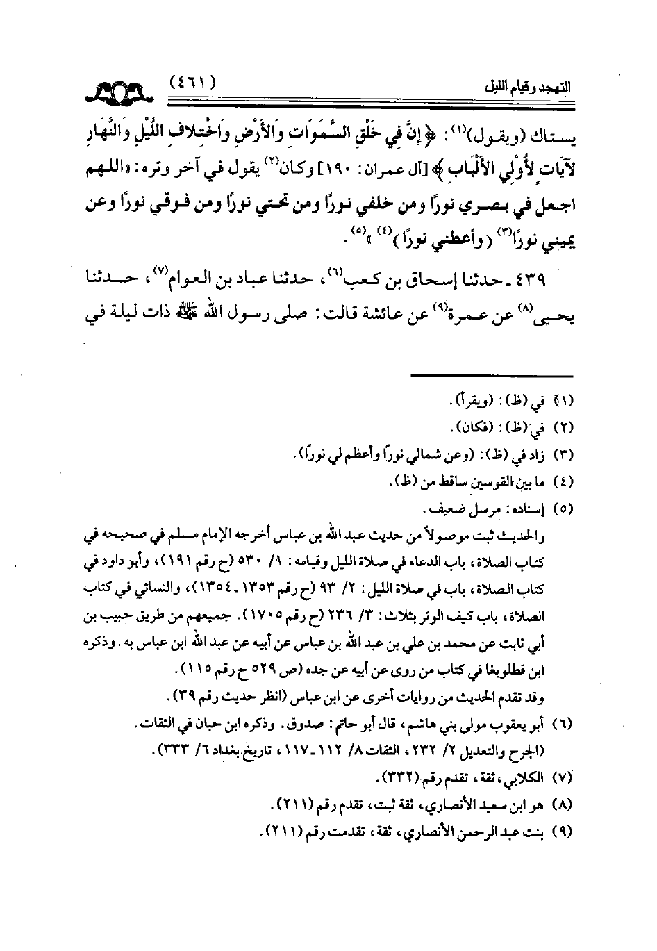 439 - حدثنا إسحاق بن كعب حدثنا عباد بن العوام حدثنا يحيى عن عمرة عن عائشة قالت صلى رسول الله ذات ليلة في