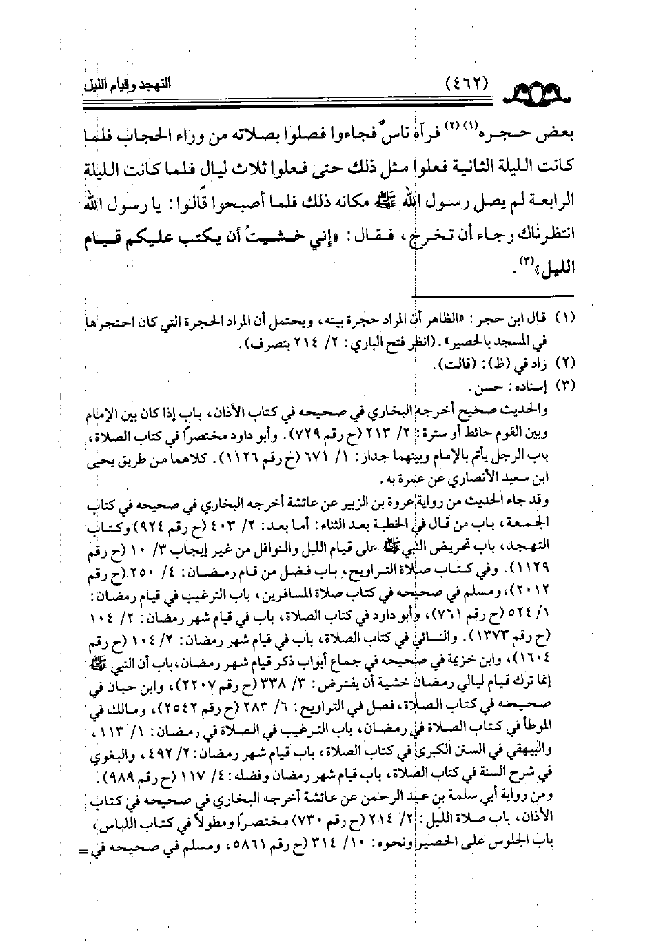 بعض حجره فرآه ناس فجاءوا فصلوا بصلاته من وراء الحجاب فلما كانت الليلة الثانية فعلوا مثل ذلك حتى فعلوا ثلاث ليال فلما كانت الليلة الرابعة لم يصل رسول الله مكانه ذلك فلما أصبحوا قالوا يا رسول الله انتظرناك رجاء أن تخرج فقال ( إني خشيت أن يكتب عليكم قيام الليل ) // إسناده حسن //