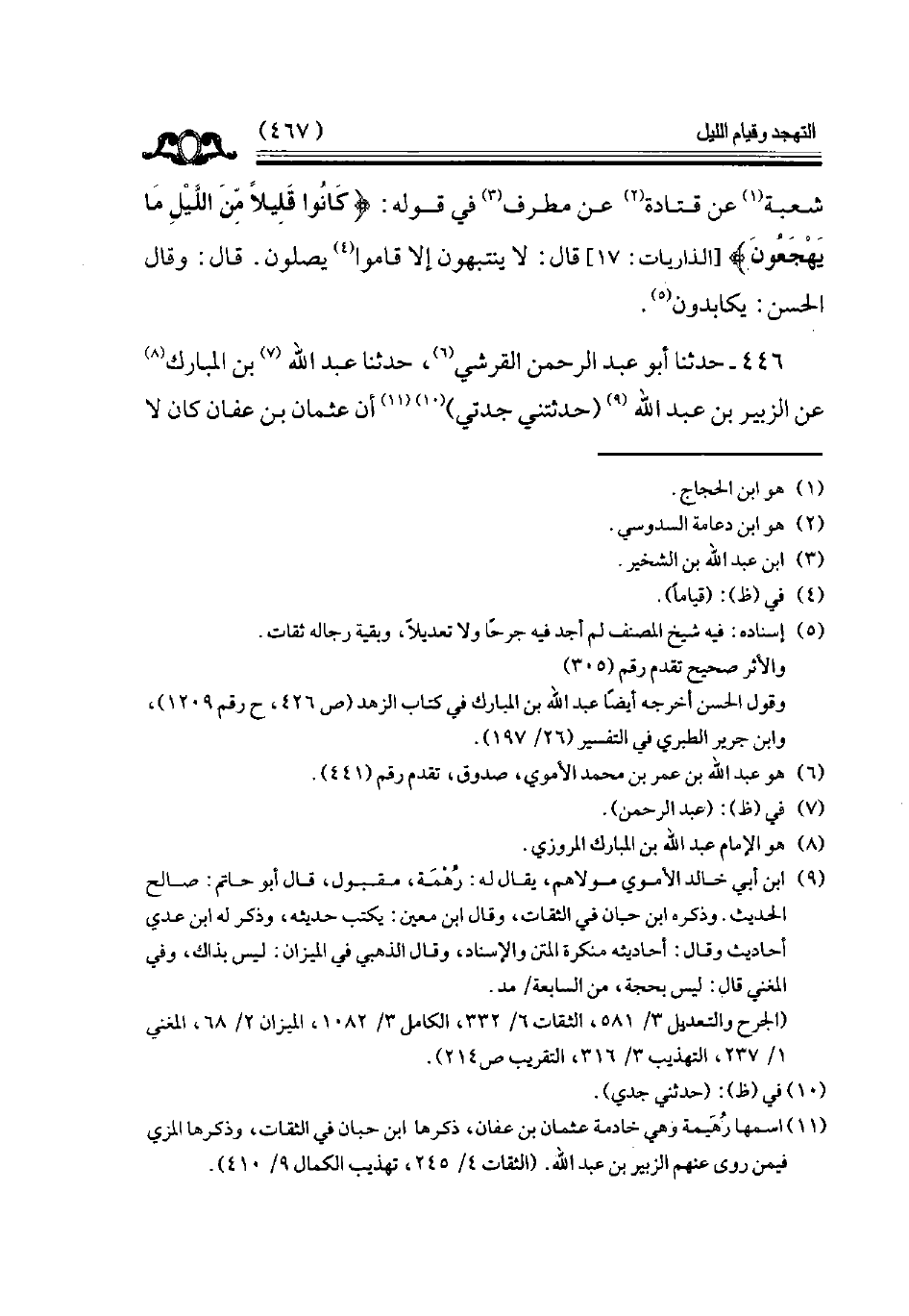 446 - حدثنا أبو عبد الرحمن القرشي حدثنا عبد الله بن المبارك عن الزبير بن عبد الله حدثتني جدتي أن عثمان بن عفان كان لا