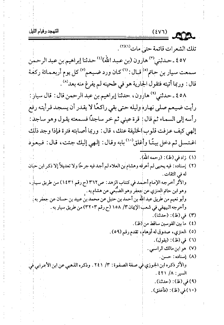 458 - حدثني هارون حدثنا إبراهيم بن عبد الرحمن قال قال سيار رأيت ضيعم صلى نهاره وليله حتى بقي راكعا لا يقدر أن يسجد فرأيته رفع رأسه إلى السماء ثم قال قرة عيني ثم خر ساجدا فسمعته يقول وهو ساجد إلهي كيف عزفت قلوب الخليقة عنك قال وربما أصابته فترة فإذا وجد ذلك اغتسل ثم دخل بيتا وأغلق بابه وقال إلهي إليك جئت قال فيعود