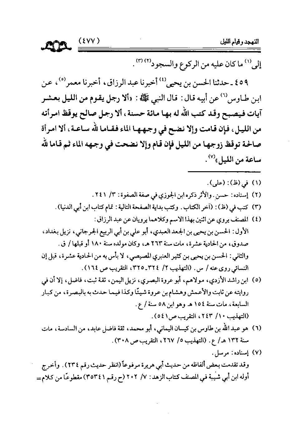 459 - حدثنا الحسن بن يحيى أخبرنا عبد الرزاق أخبرنا معمر عن ابن طاوس عن أبيه قال قال النبي ( ألا رجل يقوم من الليل بعشر آيات فيصبح وقد كتب الله له بها مائة حسنة ألا رجل صالح يوقظ امرأته من الليل فإن قامت وإلا نضح في وجهها الماء فقاما لله ساعة ألا امرأة صالحة توقظ زوجها من الليل فإن قام وإلا نضحت في وجهه الماء ثم قاما لله ساعة من الليل ) // إسناده مرسل //