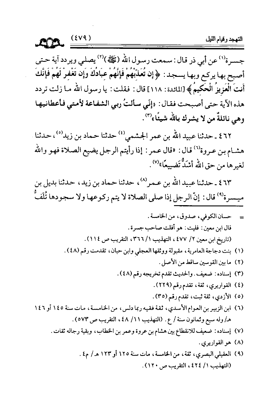 463 - حدثنا عبيد الله بن عمر حدثنا حماد بن زيد حدثنا بديل بن ميسرة قال إن الرجل إذا صلى الصلاة لا يتم ركوعها ولا سجودها تلف