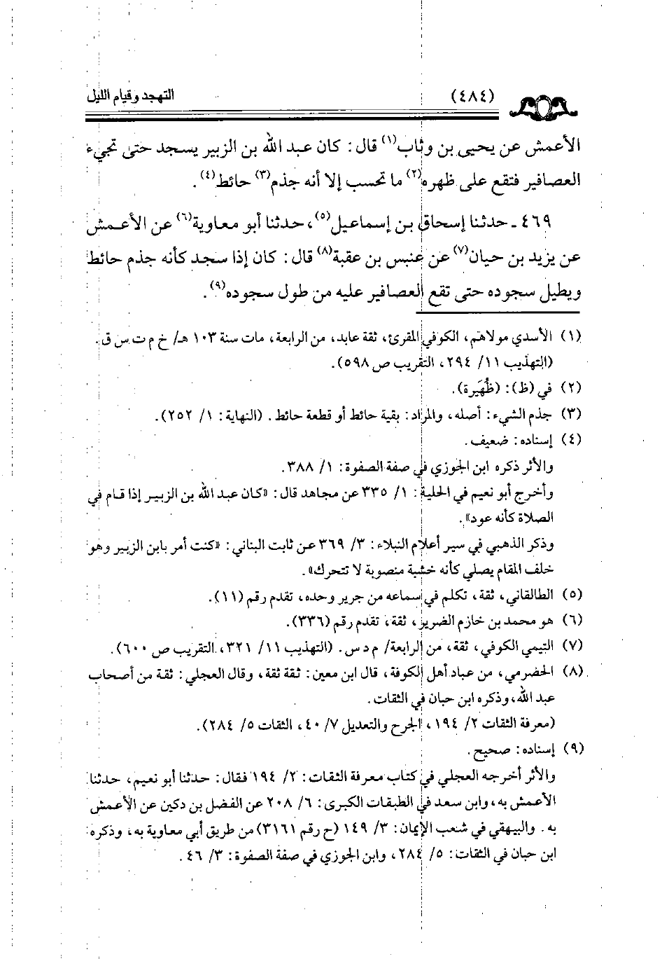 469 - حدثنا إسحاق بن إسماعيل حدثنا أبو معاوية عن الأعمش عن يزيد بن حيان عن عنبس بن عقبة قال كان إذا سجد كأنه جدم حائط ويطيل سجوده حتى تقع العصافير عليه من طول سجوده // إسناده صحيح //