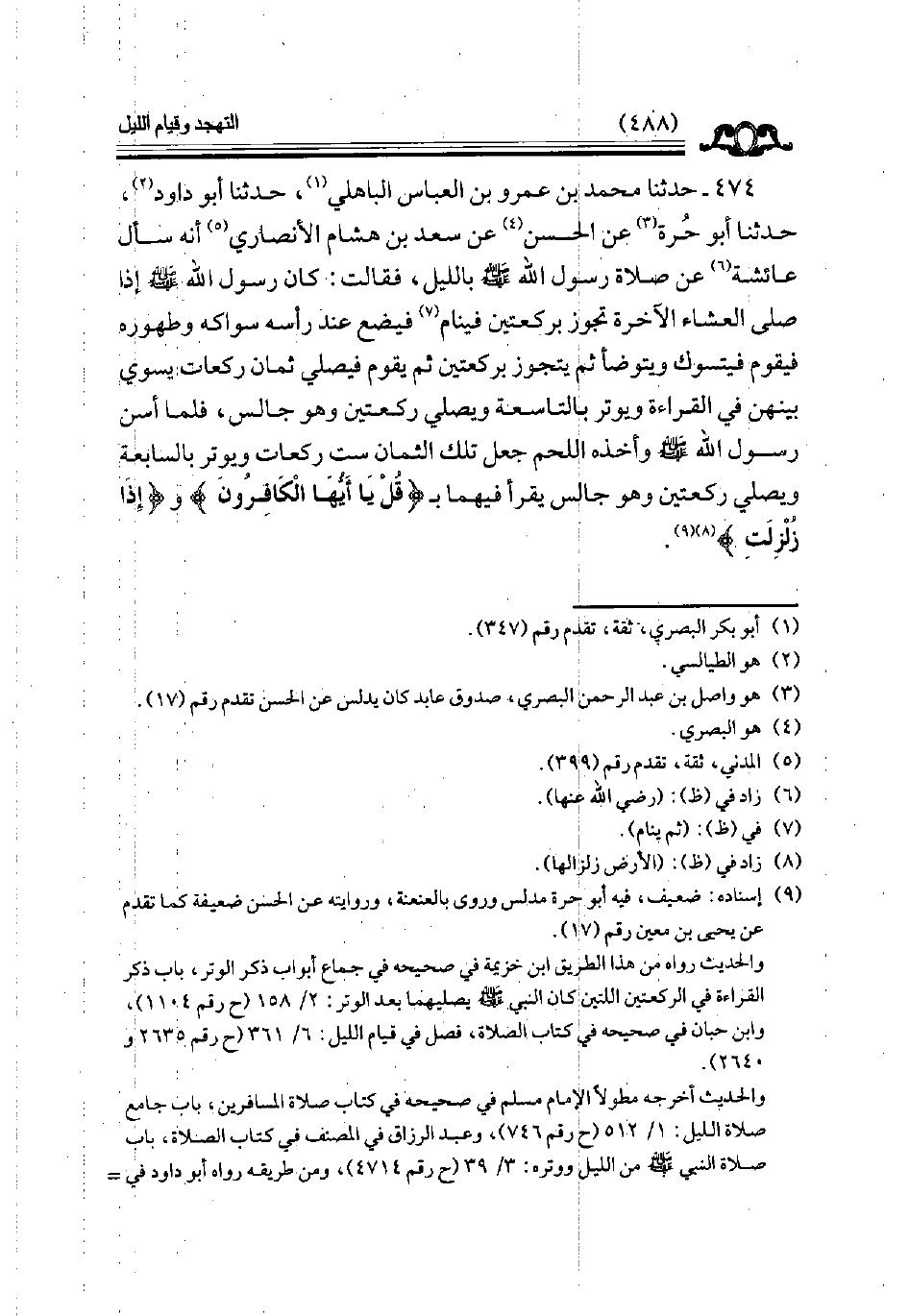 474 - حدثنا محمد بن عمرو بن العباس الباهلي حدثنا أبو داود حدثنا أبو حرة عن الحسن عن سعد بن هشام الأنصاري أنه سأل عائشة عن صلاة رسول الله بالليل فقالت كان رسول الله إذا صلى العشاء الآخرة تجوز بركعتين فينام فيضع عند رأسه سواكه وطهوره فيقوم فيتسوك ويتوضأ ثم يتجوز بركعتين ثم يقوم فصلي ثمان ركعات يسوي بينهن في القرآءة ويوتر بالتاسعة ويصلي ركعتين وهو جالس فلما أسن رسول الله وأخذه اللحم جعل تلك الثمان سلت ركعات ويوتر بالسابعة ويصلي ركعتين وهو جالس يقرأ فيهما ب ( قل يا أيها الكافرون ) و ( وإذا زلزلت ) // إسناده ضعيف //